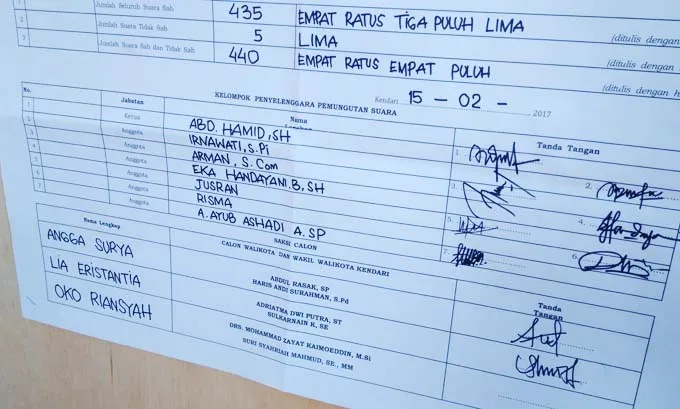 ZONASULTRA.COM, KENDARI – Oko Riansyah, saksi pasangan calon wali kota nomor 3 Derik-Suriah tidak mau menandatangani hasil perolehan perhitungan suara yang telah dilakukan di TPS Kelurahan Anawai, Kecamatan Wua-wua. Oko mengaku hasil perhitungan tersebut tidak sesuai dengan hasil prediksi yang timnya inginkan.