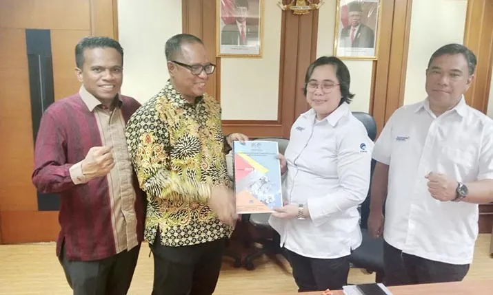 BTS - Pj Bupati Mubar, Bahri didampingi Kadis Kominfo Mubar, Al Rahman saat menyerahkan usulan pembangunan BTS di Direktorat Telekomunikasi Kementrian Kominfo. (Foto istimewa).