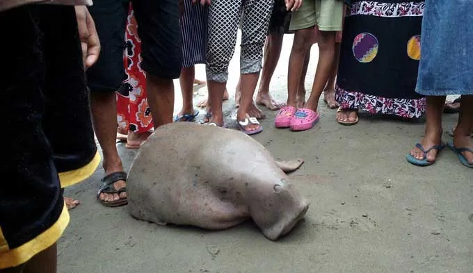 ZOANSULTRA.COM, WANGGUDU – Seekor mamalia laut jenis Dugong dugon atau duyung tertangkap jaring nelayan di perairan laut Desa Motui, Kecamatan Motui, Kabupaten Konawe Utara (Konut), Sulawesi Tenggara (Sultra), Jumat (16/2/2018).