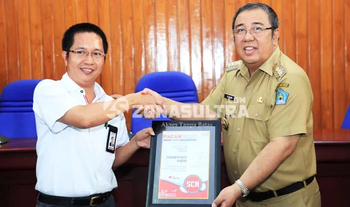 SMART CITY : Pimpinan Telkom Indonesia Kendari menyerahkan Piagam penghargaan Smart City pada Walikota Kendari Senin (29/8/2016). (Sumarlin/ZONASULTRA.COM)