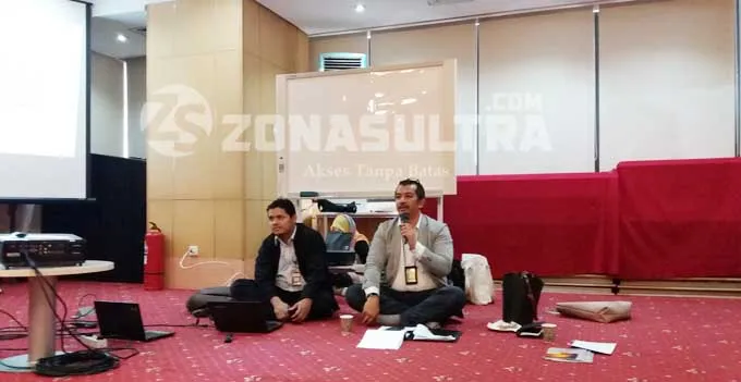 DISKUSI TAMBANG : Dian Patria (sebelah kanan) aktivis Gerakan Nasional Penyelamatan Sumber Daya Alam (SDA) Indonesia (GPNSI) selaku narasumber diskusi yang dilakukan bersamaa awak media di Gedung KPK, Selasa (30/8/2016). Dalam diskusi itu terungkap banyak perusahaan tambang tidak membayar Penerimaan Negara Bukan Pajak (PNBP). (FOTO : RIZKI ARIFIANI/ZONASULTRA.COM)