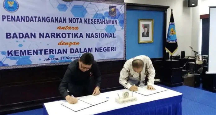 ZONASULTRA.COM, JAKARTA – Badan Narkotika Nasional (BNN) dan Kementerian Dalam Negeri (Kemendagri) melakukan penandatanganan nota kesepahaman dalam bidang pemanfaatan data kependudukan. Penandatangan dilakukan langsung Menteri Dalam Negeri (Mendagri) Tjahjo Kumolo dan Kepala BNN Heru Winarko di Ruang Rapat BNN, Cawang, Jakarta Timur, Jumat (27/09/2019).