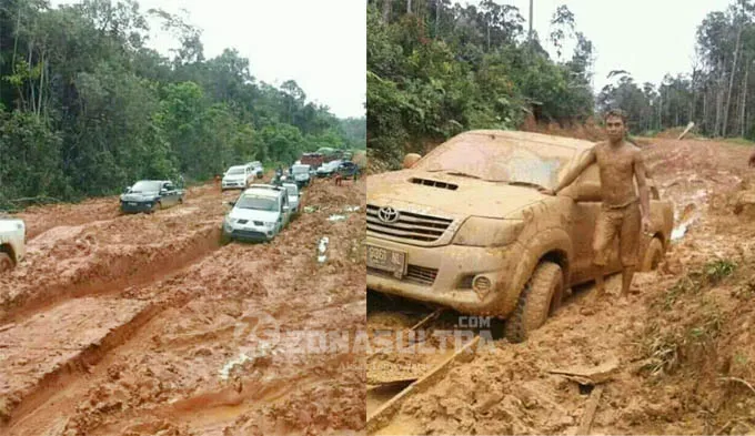 JALAN RUSAK – Ruas jalan di Kecamatan Morosi serta Kecamatan Meluhu Kabupaten Konawe kian parah. Puluhan mobil kandas ditengah kubangan lumpur. Imbasnya, sejumlah barang dan bahan makan di pasaran wilayah Kabupaten Konawe Utara (Konut) melonjak naik. (Jefri/ZONASULTRA.COM).