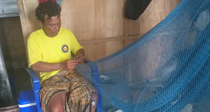 Dari pagi hingga menjelang siang, cuaca yang tak kunjung cerah membuatnya tak pergi melaut. Dia di rumah saja merampungkan jaring cumi yang sudah beberapa pekan disambungnya. Padahal, bila pergi melaut maka potensi pendapatannya di hari itu bisa Rp300 ribu sampai Rp500 ribu.