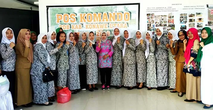 FOTO BERSAMA - Foto bersama Ketua IBI Sultra Janita dan 23 bidan yang menjadi korban banjir atas tanggung jawabnya menolong para korban banjir. (Jefri/ZONASULTRA.COM)