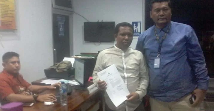LAPOR POLISI - Ketua KPU Sulawesi Tenggara (Sultra) La Ode Abdul Natsir Muthalib menemani Ketua KPU Wakatobi Abdul Rajab saat melapor di Polres Kendari, Jumat (21/12/2018) malam. (Muhamad Taslim Dalma/ZONASULTRA.COM)