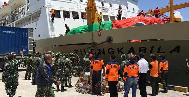 Seluruh bantuan yang dikirim hari ini ditampung dalam kontainer dan dipindahkan ke dalam kapal oleh tim KODIM 1417 Kendari dan Badan Penanggulan Bencana Daerah (BPBD) Kota Kendari.
