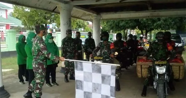 Pembagian Sembako - Dandim 1416/Muna Letkol Inf. Febi Triandoko bersama Ketua Persit Kodim dan jajarannya saat melepas para babinsa untuk mengantarkan paket sembako ke rumah warga yang membutuhkan, Jumat (8/5/2020). (Kasman/ZONASULTRA.COM).