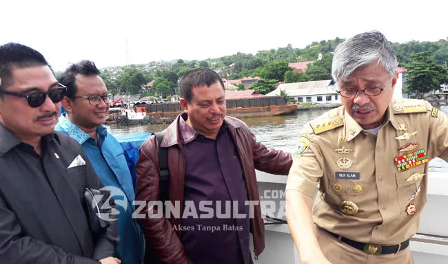 ZONASULTRA.COM,KENDARI– Gubernur Nur Alam meyakinkan Wakil Ketua Komisi V Dewan Perwakilan Rakyat (DPR) RI Fraksi Partai Demokrat Michael Wattimena dalam diskusi saat kunjungan kerja, Senin (21/3/2016) di Teluk Kendari lokasi pembangunan jembatan Bahtermas, kota lama.
