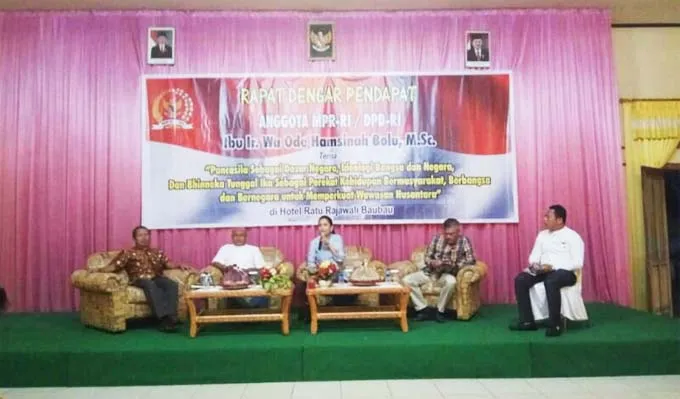 RAPAT DENGAR PENDAPAT – Anggota DPD RI Hamsina Bolu (tengah) saat berbicara dalam acara Rapat Dengar Pendapat di Hotel Ratu Rajawali Baubau, Selasa (18/4/2017). (Nanang/ZONASULTRA.COM)