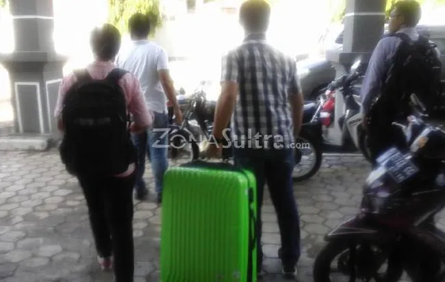Penyidik Komisi Pemberantasan Korupsi (KPK) membawah sebuah koper besar warna hijau dan sebuah dos, usai memeriksa mantan Bupati Bombana, Atikurahman, Senin (9/11/2015).