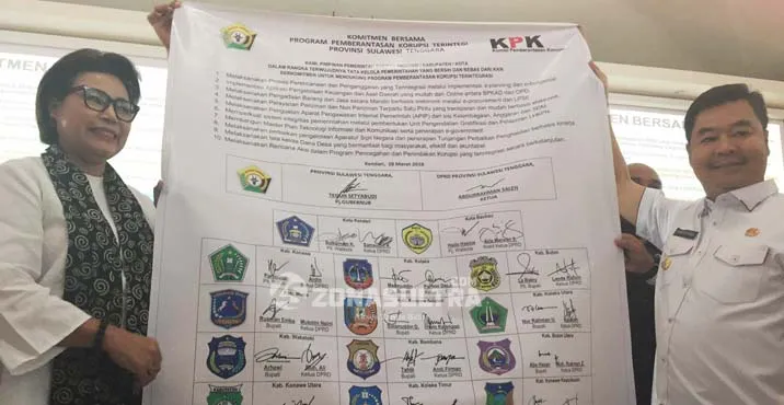 KPK - Komisi Pemberantasan Korupsi (KPK) membentuk Komite Advokasi Daerah (KAD), bagi pengusaha serta regulator yang ada di Sulawesi Tenggara (Sultra), Rabu (28/3/2018). Pembentukan yang dilaksanakan di aula Bahteramas kantor Gubernur Sultra, disaksikan langsung oleh Pj Gubernur Sultra Teguh Setyabudi serta seluruh Bupati dan Wali Kota se Sultra. (Randi Ardiansyah/ZONASULTRA.COM)