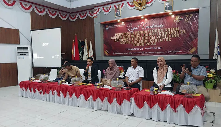 Komisi Pemilihan Umum (KPU) Konawe Utara (Konut) menggelar rapat koordinasi terkait persiapan pendaftaran calon Bupati dan Wakil Bupati pada Pemilihan Kepala Daerah (Pilkada) serentak tahun 2024 di Aula Oheo KPU Konut, Minggu (25/8/2024).