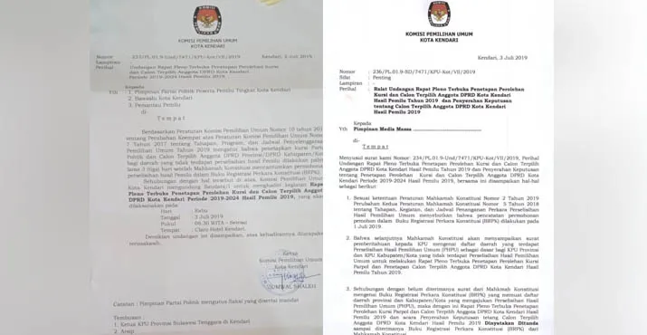KPU meralat undangan tersebut pada hari pelaksaan rapat pleno terbuka 3 Juli 2019. Hal itu diumumkan KPU melalui surat ralat bernomor 236/PL.01.9.SD/7471/KPU-Kot/VII/2019 yang ditandatangani Ketua KPU Kendari Jumwal Saleh.