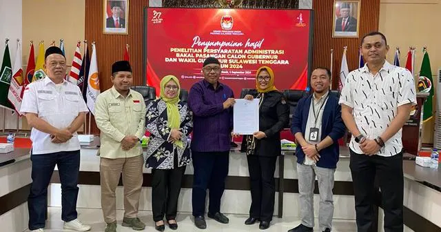 ZONASULTRA.ID, KENDARI – Komisi Pemilihan Umum (KPU) Provinsi Sulawesi Tenggara menyerahkan berita acara hasil verifikasi administrasi dokumen syarat calon Gubernur dan Wakil Gubernur Sultra tahun 2024. Acara tersebut berlangsung di Aula HKM Kantor KPU Sultra pada Kamis (5/9/2024).