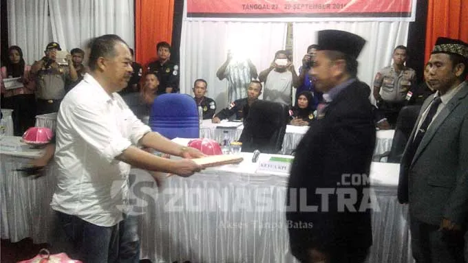 PENYERAHAN DOKUMEN – Bakal Calon (Balon) Bupati Buton H.Hamin, saat memberikan penyerahan dokumen persyaratannya kepada Ketua KPUD Buton Alimuddin Sikuru, dikantor KPUD Buton beberapa waktu lalu. Komisi Pemilihan Umum Daerah (KPUD) Kabupaten Buton Sulawesi Tenggara (Sutra) menolak berkas pencalonan pasangan Hamin – Farid Bachmid yang datang mendaftar untuk pencalonan pemilihan kepala daerah di Buton. (Nanang/ZONASULTRA.COM)