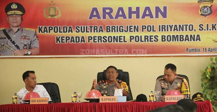 ZONASULTRA.COM, RUMBIA – Kepala Kepolisian Daerah (Kapolda) Sulawesi Tenggara (Sultra) Brigjen Pol Iriyanto melakukan kunjungan kerja (Kunker) di Mako Polres Bombana, Senin (16/4/2018).