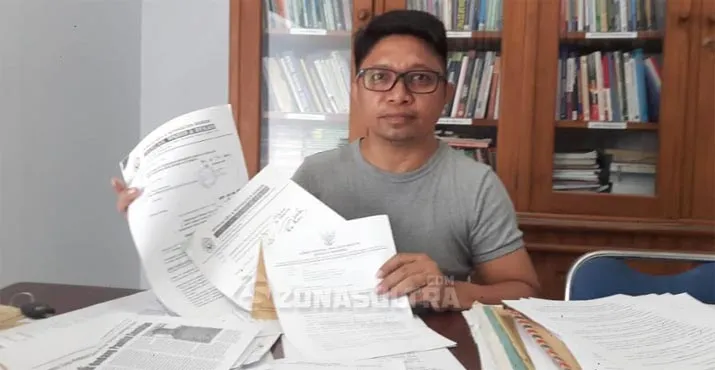 GANTI RUGI - Dahlan Moga menunjukkan dokumen tentang masalah Lapangan Golf Kendari di Kantornya, Rabu (1/8/2018). Dokumen itu sejak tahun 2004 hingga yang terakhir putusan Peninjauan Kembali Mahkamah Agung pada 27 Juli 2015. (Muhamad Taslim Dalma/ZONASULTRA.COM)