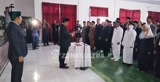 PELANTIKAN - Bupati Wakatobi, Arhawi melantik 140 orang pejabat struktural eselon III dan IV di lingkup jajarannya. Pelantikan itu digelar di gedung Dharma Wanita Wangiwangi, Senin (8/1/2018). (Nova Ely Surya/ZONASULTRA.COM)