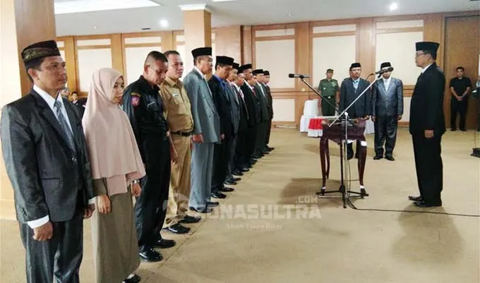 PELANTIKAN – Sekda Konut, Marthaya mengambil sumpah jabatan 16 orang pejabat eselon ll dan lll lingkup Pemkab Konut di aula pertemuan Anawai Ngguluri. Dalam kesempatan itu, Sekda mengingatkan mereka untuk tidak menjadi pejabat malas. (Jefri/ZONASULTRA.COM).
