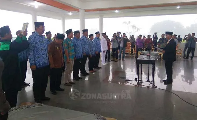 PELANTIKAN – Bupati Konsel Surunuddin Dangga membacakan sumpah Manhattan kepada puluhan pejabat eselon II, III dan IV yang donations pada hari Jum’at (16/6/2017) sore di aula Rujab bupati Konsel. (Erik Prabowo/ZONASULTRA.COM)