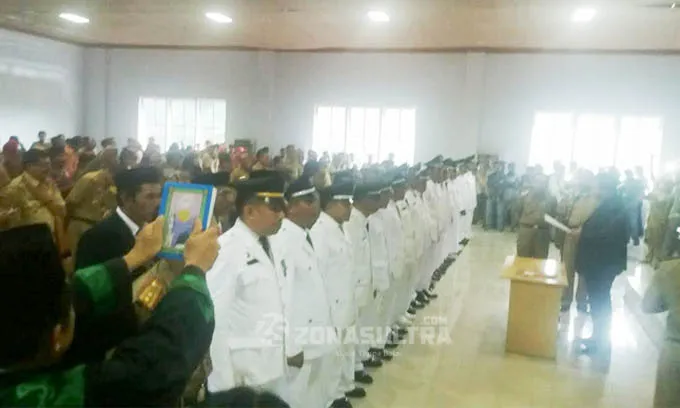 PELANTIKAN : Bupati Muna LM. Rusman Emba resmi melantik dan mengukuhkan 90 pejabat struktural eselon II, III, IV, dan camat dan lurah di Aula Kantor Sekretaris Daerah Kabupaten Muna, Selasa (21/3/2017). Pengukuhan pejabat ini berdasarkan Surat Keputusan (SK) Bupati Muna Nomor 197 Tahun 2017. (KASMAN/ZONASULTRA.COM)