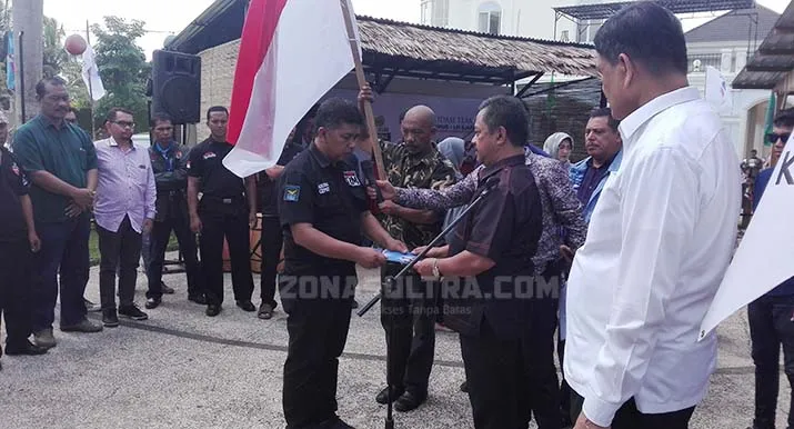 PELANTIKAN TIM - Bakal calon Gubernur Sulawesi Tenggara Rusda Mahmud saat menyerahkan map berisi janji tim pemenangan kepada Ketua Tim Pemenangan Wilayah Sultra RM-SK, Nur Iksan Umar. Tim pemenangan RM-SK ini dilantik langsung oleh Rusda Mahmud di posko pemenangan RM-SK, Jumat (19/1/2018). (RAMADHAN HAFID/ZONASULTRA.COM)