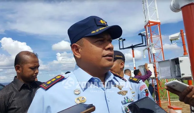 TINJAU AWOS – Danlanud Halu Oleo Letkol Pnb Muhram Jayahadi Kusuma saat meninjau AWOS di landasan pacu Bandara Haluoleo. (Lukman Budianto/ZONASULTRA.COM)