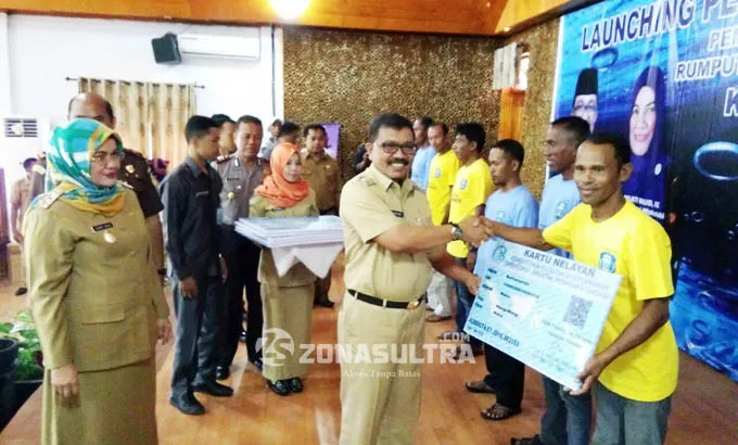 PERIKANAN BERSINAR : Penyerahan kartu nelayan secara simbolis oleh Bupati Wakatobi bersama Wakil Bupati Wakatobi kepada para nelayan. (NOVA ELY SURYA/ZONASULTRA.COM)