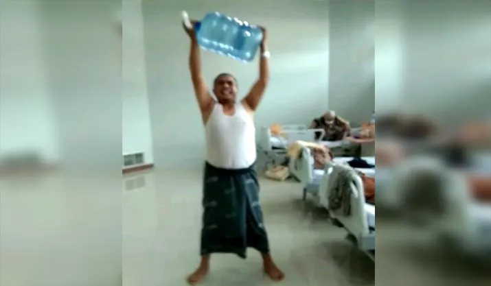 Seperti yang ditunjukkan salah satu pasien postif Covid-19 asal Kota Kendari, Sulawesi Tenggara (Sultra). Pria berusia 42 tahun ini dengan mengenakan sarung dan baju dalam tengah berolahraga, mengangkat galon berisi air sambil berlari-lari kecil di dalam ruang isolasi RSUD Bahteramas Kendari.