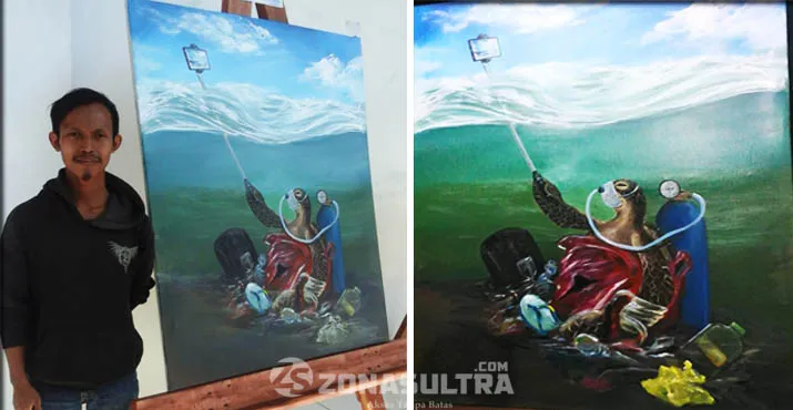 ZONASULTRA.COM, KENDARI – Nawir Wira Marfudin, peserta lomba melukis Pekan Seni Mahasiswa Nasional (Peksiminas) XIII asal Jawa Barat memilih membuat karya lukisan dengan tema pencemaran laut. Dalam karyanya itu, ia melukis penyu, sampah, dan oksigen sebagai simbol masalah pencemaran laut.