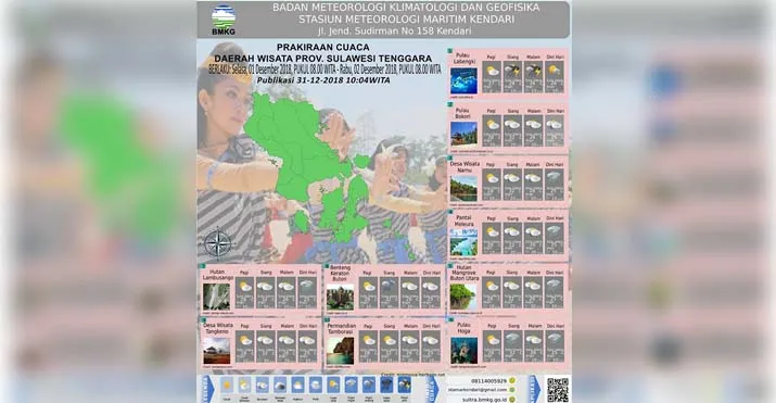 ZONASULTRA.COM, KENDARI – Momen tahun baru biasanya dimanfaatkan oleh keluarga untuk liburan bersama. Dan pantai masih menjadi pilihan bagi para keluarga. Namun sebelum ke pantai, yuk simak dulu prakiraan cuaca di berbagai lokasi wisata di Sultra pada 1 Januari 2019 berdasarkan analisis BMKG.