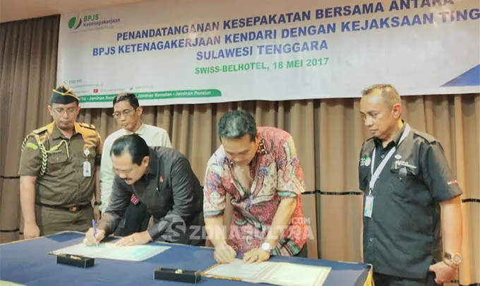 ZONASULTRA.COM, KENDARI – Badan Penyelenggara Jaminan Sosial (BPJS) Ketenagakerjaan bersama Kejaksaan Tinggi (Kejati) Sulawesi Tenggara (Sultra) menyatukan visi melalui penandatanganan nota kesepahaman untuk melindungi hak pekerja, Kamis (18/5/2017) di Swissbel Hotel Kendari.