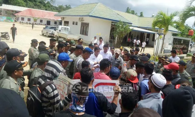 DEMO – Wakil bupati Konkep, Andi Muhammad Lutfi saat menemui para demonstran dihalaman kantor bupati Konkep (05/07) dilangara. (Arjab Karim/ZONASULTRA.COM)