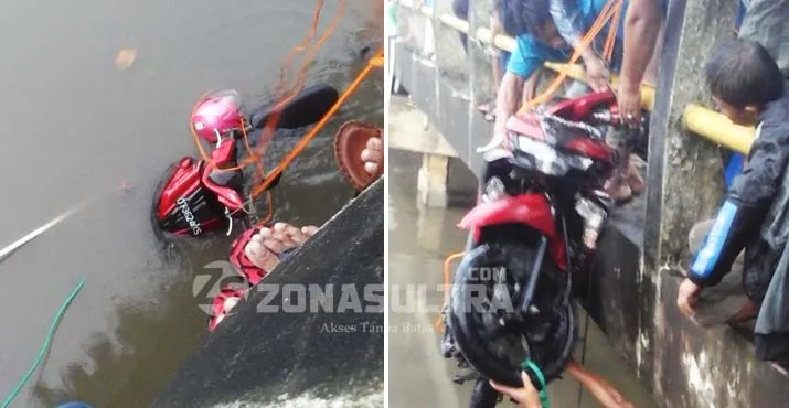 ZONASULTRA.COM, KENDARI– Sebuah sepeda motor jatuh ke dalam kali di Jembatan Jalan Edy Sabara Kota Kendari, Selasa (8/11/2016) sore.