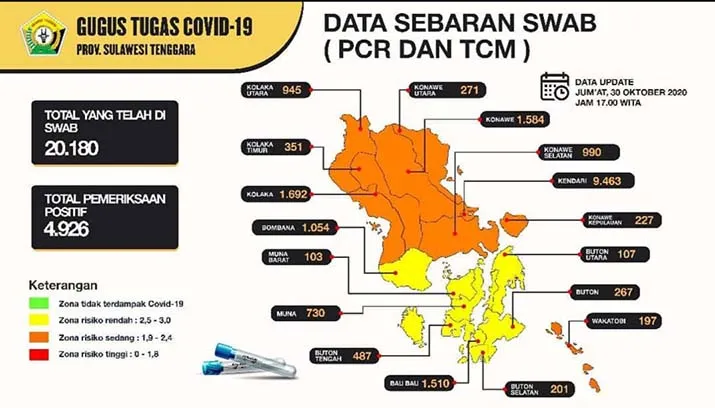 Data Satgas Covid-19 Sultra, pengetesan yang dilakukan selama pandemi per Jumat (30/10/2020) menggunakan PCR dan TCM sebanyak 20.180 sampel dengan hasil sebanyak 4.926 di antaranya terkonfirmasi positif Covid-19.