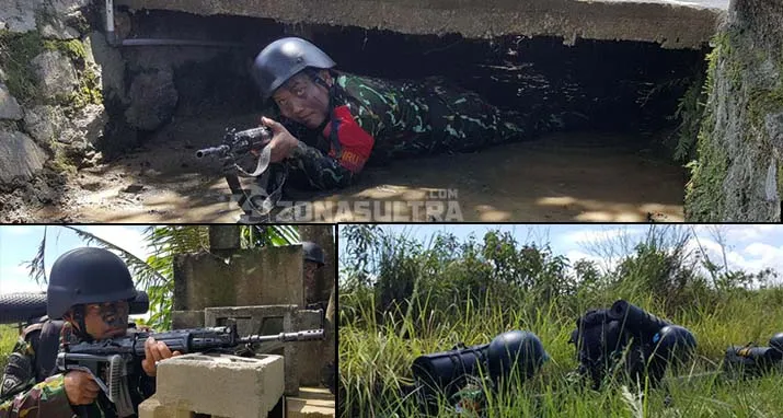 Sembari berlindung, mereka juga mengarahkan senjata laras panjang ke arah suara ledakan. Ada yang tiarap, ada yang jongkok, ada pula yang berlindung di balik pepohonan. Setelah instruktur memberikan aba-aba selesai, barulah mereka kembali mengambil barisan.