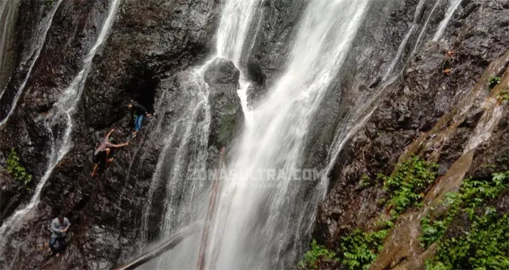 AIR TERJUN BHEMBE - Nampak air jatuh menyusuri tebing hitam pekat kurang lebih setinggi 100 meter, Sabtu (4/7/2020). Air Terjun Bhembe ini terletak di hutan belantara Dusun Lagunturu, Desa Nambo, Kecamatan Lasalimu, Kabupaten Buton, Sultra. (Risno Mawandili/ZONASULTRA.COM)