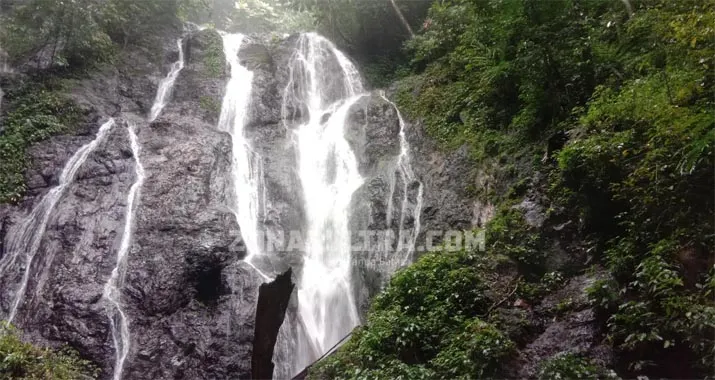 Air jernih itu terlihat menguning setelah jatuh menghantam keras ke dasar tebing. Percikannya menghembuskan angin kencang membentuk kabut tipis menghalagi lensa kamera untuk sekadar berswafoto.
