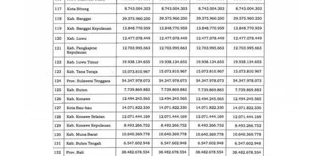Jumlah anggaran DAU Sulawesi Tenggara yang ditahan selama September hingga Desember 2016 mencapai Rp 217,391 milyar. Selanjutnya Buton sebesar Rp 30,9 milyar, Konawe sebesar Rp 49,97 milyar, Baubau sebesar Rp 56,28 milyar. Lalu Konawe Selatan sebesar Rp 48,28 milyar, Konawe Kepulauan sebesar Rp 33,97 milyar, Muna Barat sebesar Rp 42,56 milyar, dan Buton Tengah sebesar Rp 26,19 milyar.