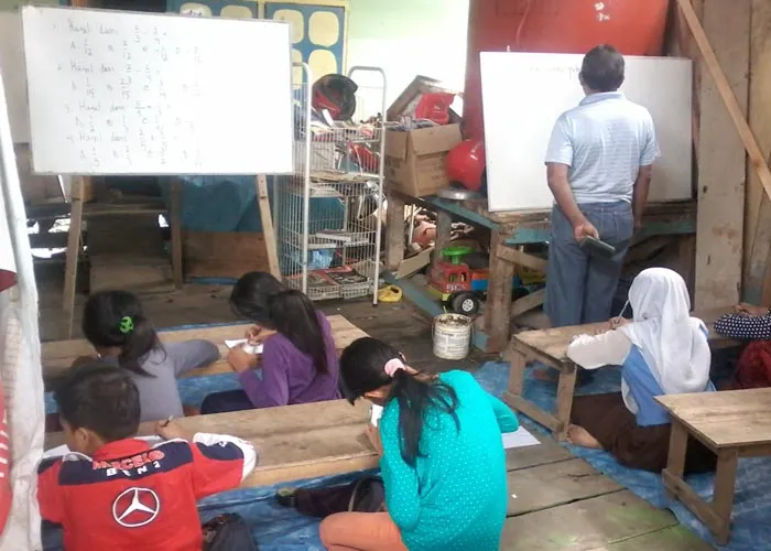 Pasti tidak ada yang menyangka jika ruang berukuran 4×6 meter itu adalah ruang kelas. Lihat saja, tumpukan barang bekas nyaris memenuhi ruangan itu. Bahkan di belakang papan tulis yang menjadi penanda bahwa itu tempat belajar mengajar terdapat sebuah kurungan ayam jago jenis Bangkok.