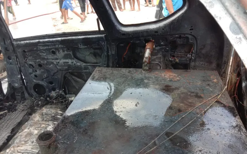 Setelah menyalakan kunci kontak kendaraannya, tiba-tiba muncul percikan api dari dalam dasbor mobil. Api yang dengan cepat membesar langsung membakar seluruh badan mobil.