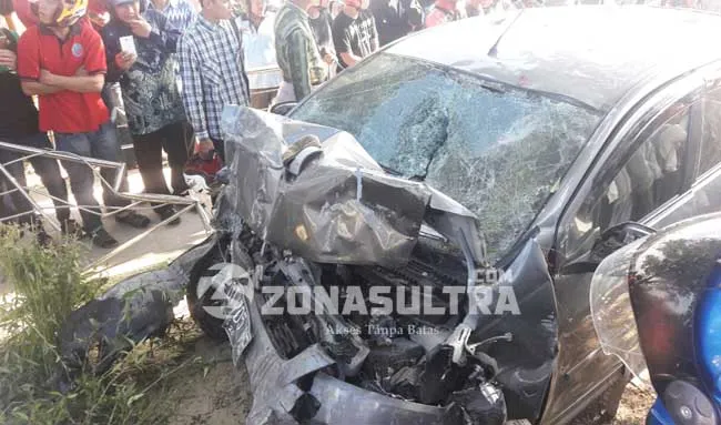Berdasarkan pantauan awak Zonasultra.com mobil mengalami kerusakan parah bagian depan hancur, sedangkan bagian belakang mobil tidak mengalami kerusakan parah.