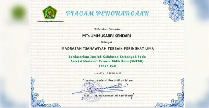 ZONASULTRA.COM, KENDARI– Madrasah Tsanawiyah (MTs) Ummusshabri Kendari masuk dalam nominasi pemilihan Madrasah Tsanawiyah terbaik di Indonesia. MTs ini berada di peringkat lima dengan 16.667 jumlah Madrasah Tsanawiah yang ada di Indonesia, sedangkan yang masuk dalam objek pemilihan kurang lebih 8.000 madrasah.