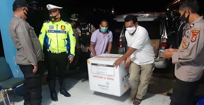ZONASULTRA.COM, LAWORO – Sebanyak 1.560 dosis vaksin Sinovac Covid-19 telah tiba di Kabupaten Muna Barat (Mubar) dengan pengawalan ketat dari pihak kepolisian, Jumat (29/1/2021) sekitar pukul 21.00 WITA malam. Vaksin tersebut langsung dimasukkan ke lemari pendingin yang sudah disiapkan di Dinkes Mubar.