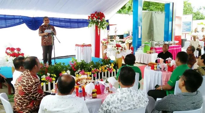 PERESMIAN SPBUN - Bupati Buton Utara Abu Hasan saat memberikan sambutan pada peresmian SPBUN di Kelurahan Lipu Kecamatan Kulisusu, Sabtu (3/3/2018). (Foto Istimewa).