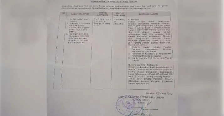 Hal itu diumumkan Gakkumdu dan dipajang di Kantor Badan Pengawas Pemilihan Umum (Bawaslu) Kota Kendari, Jumat (22/3/2019).