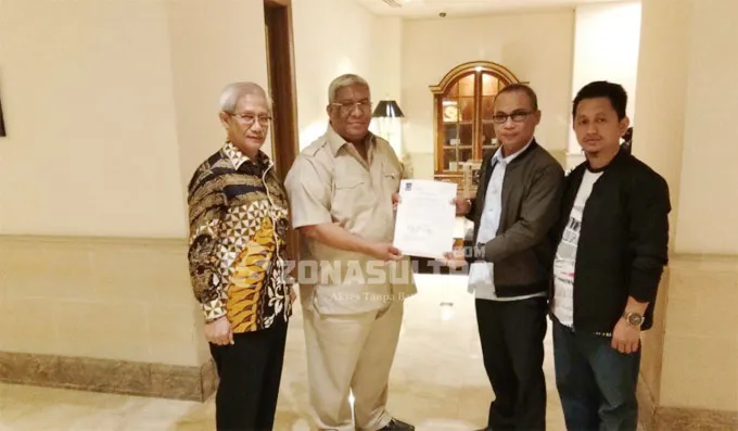 DUKUNGAN NASDEM – Sekretaris Dewan Pimpinan Wilayah (DPW) Nasdem Sulawesi Tenggara (Sultra), La Ode Ikhsanuddin Saafi (kanan) menyerahkan formulir B.1-KWK (pendaftaran jalur partai) ke Ali Mazi-Lukman Abunawas di Hotel Borobudur, Jakarta, Kamis (4/1/2018) malam. (Foto: Nasdem for ZonaSultra.Com).