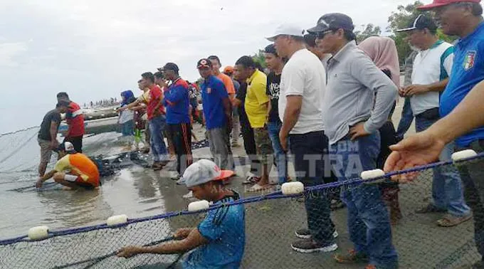 KUNJUNGAN - Terlihat Bupati dan wakil Bupati Konut H.Ruksamin-Raup, bersama SKPD Konut serta masyarakat yang sedang melihat para nelayan Desa Laimeo, Kecamatan sawa sedang menangkap ikan. (Jefri/ZONASULTRA.COM)