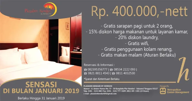 General Manager PlazaInn Kendari by Horison, Priehandhono Setiabudhi mengatakan, pihaknya juga memberikan promo paket untuk menginap di hotel bintang tiga yang terletak di Jalan Antero Hamra ini.